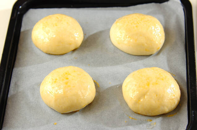 天板に並べて温かいところに置き、生地がひとまわり大きく膨らむまで二次発酵させ(35~45分)、溶き卵をぬる。