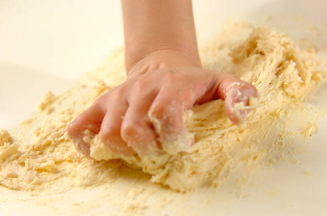 生地を台の上に出し、こねる。表面がなめらかになり、膜がしっかりとはったら、温かいところに置き、約2倍に膨らむまで待つ(50~60分)。