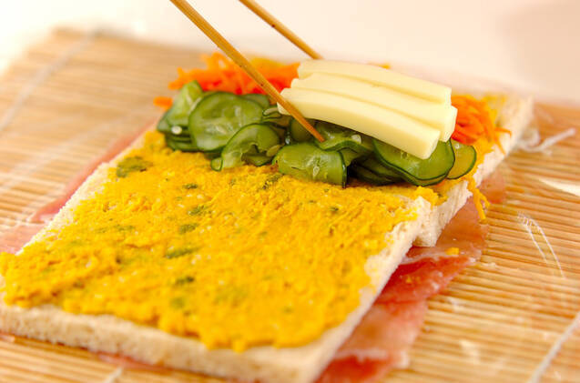 (1)に<マッシュパンプキン>をぬり広げ、さらにニンジン、キュウリ、プロセスチーズをのせてラップごと巻く。