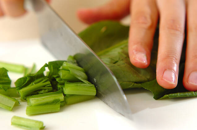 小松菜は根元を少し切り落とし、幅2cmに刻む。
