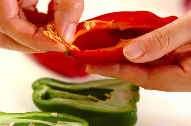 ピーマン、赤ピーマンは縦半分に切ってヘタと種を取り、さらに縦細切りにする。
