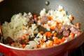 フライパンにサラダ油小1を中火にかけて牛肉を炒め、色が変われば玉ネギ、ニンジンを加え、玉ネギが透き通るまで炒めあわせる。塩、粗挽き黒コショウ、しょうゆで味を整え、いったん取り出す。
