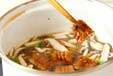 1の<合わせだし>に青ネギ、シイタケをちりばめ、ウナギの蒲焼きをのせる。