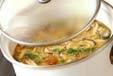 再び煮立てば火を弱め、溶き卵を回し入れる。周りが固まり、中央が半熟になれば、蓋をして火を止め、1分そのまま置く。