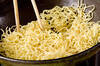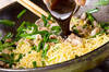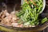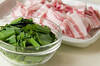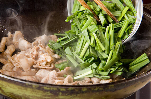 フライパンにゴマ油大1を加えて豚肉を炒め、しっかりめに塩コショウを振り掛け、ニラを加えてしんなりするまで炒めあわせる。