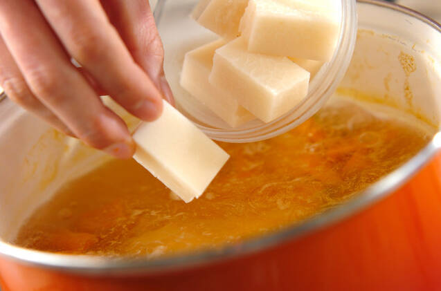 カボチャが柔らかくなり、竹串でカボチャを刺してスッと刺さったら角餅を加える。角餅が柔らかくなったら白みそを溶き入れ、器によそってかつお節をかける。