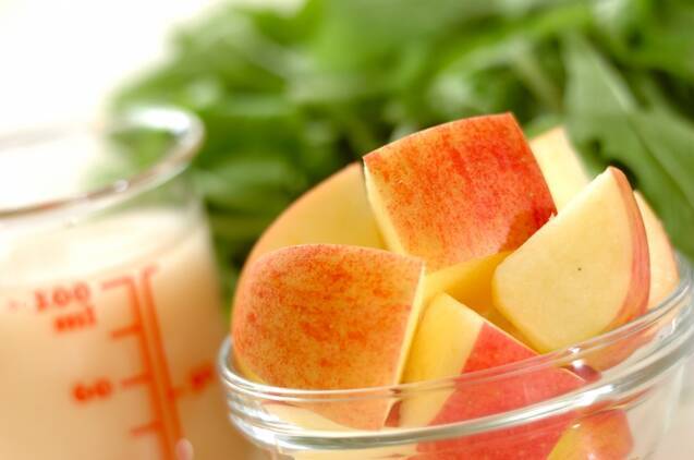 水菜は根元を切り落とし、適当な大きさに切る。リンゴは芯と種を取り、皮つきのまま適当な大きさに切る。