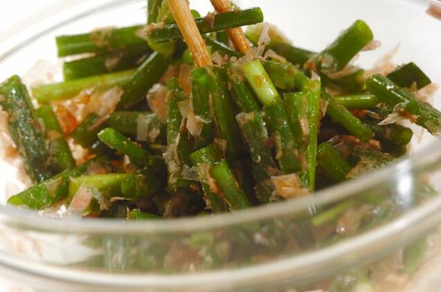 <調味料>のボウルに細ネギ、かつお節を加えて和え、器に盛る。