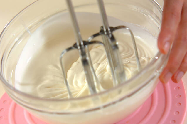 (6)にキルシュを加えてハンドミキサーでほぐし、絞り袋に入れる。<ホイップクリーム>を作る。ボウルに、生クリームと砂糖を入れて8分立てに泡立てる。絞り袋に入れる。