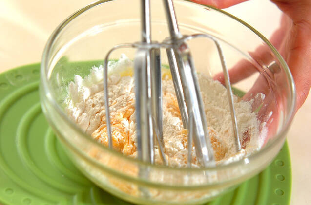 <カスタードクリーム>を作る。耐熱容器に卵黄を溶きほぐし、砂糖を加えて白っぽくなるまで混ぜる。強力粉を混ぜ、牛乳を2回に分けて加え、その都度均一に混ぜる。