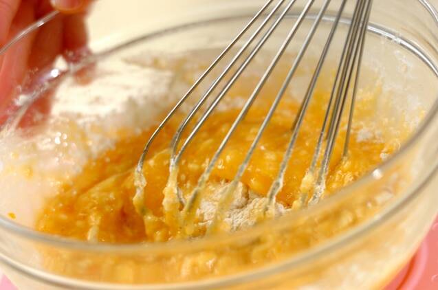 ボウルに卵、みりん、ハチミツ、牛乳を入れて混ぜ合わせ、ホットケーキミックスも加えて混ぜ合わせる。