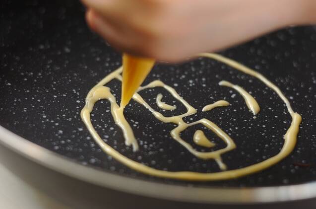 絞り袋に(1)の生地を少量入れて先を少しだけ切り、薄くサラダ油をひいたフライパンに似顔絵を描く。