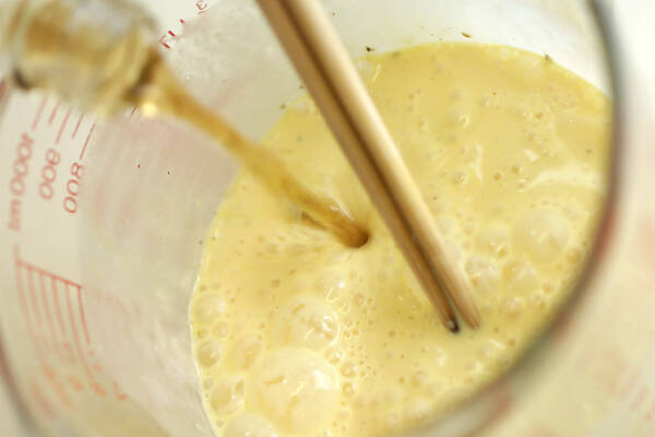<卵液>を混ぜあわせる。ソーセージはカボチャに合わせて切る。