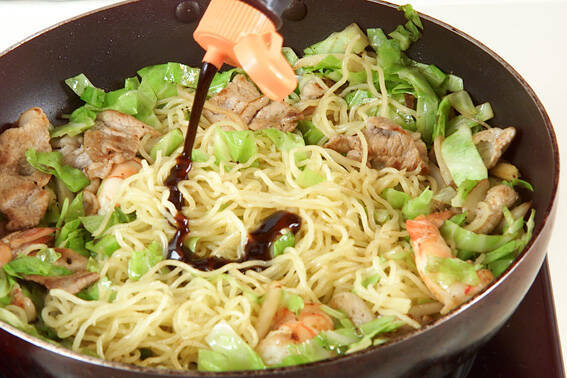 2の麺を戻し入れ、炒め合わせる。焼そばソースを加えて炒めるようにからめ、冷ましてから詰める。