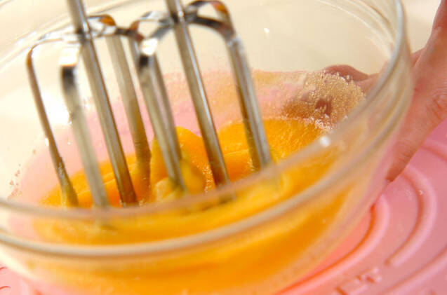 <クレームシトロン>を作る。卵は溶きほぐして、グラニュー糖と片栗粉を加えてハンドミキサーの低速で混ぜる。