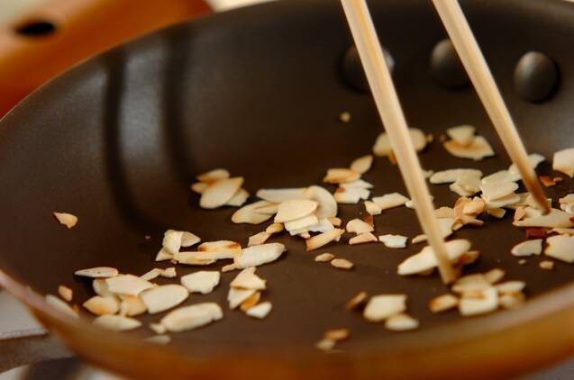 スライスアーモンドはフライパンに入れ、色よく煎って取り出す。