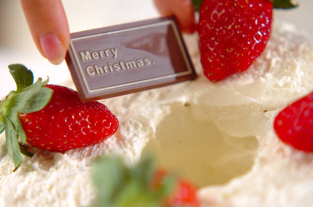 残りの生クリームをバウムクーヘンの上面に広げて塗る。器にバウムクーヘンを崩さないようにのせ、スプーンの背で生クリームの表面に模様をつけ、イチゴを飾り、アラザン、粉砂糖を振り掛け、あったらクリスマスプレートをのせる。