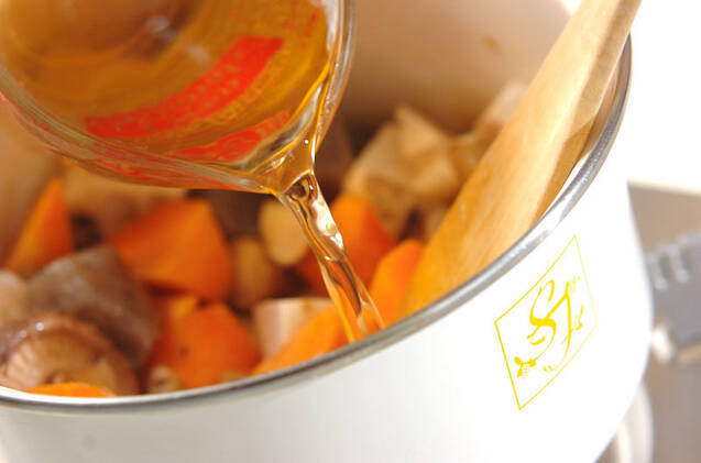同じ鍋に残りのサラダ油を加えて熱し、板コンニャク、ゴボウ、ニンジン、レンコン、里芋、シイタケを加えて炒め合わせ、だし汁と<調味料>の材料を加える。