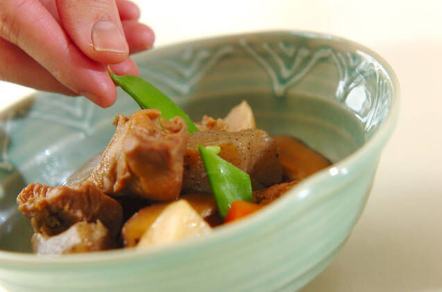火を強めて汁気が少なくなるまで煮詰め、器に盛り、キヌサヤを散らす。