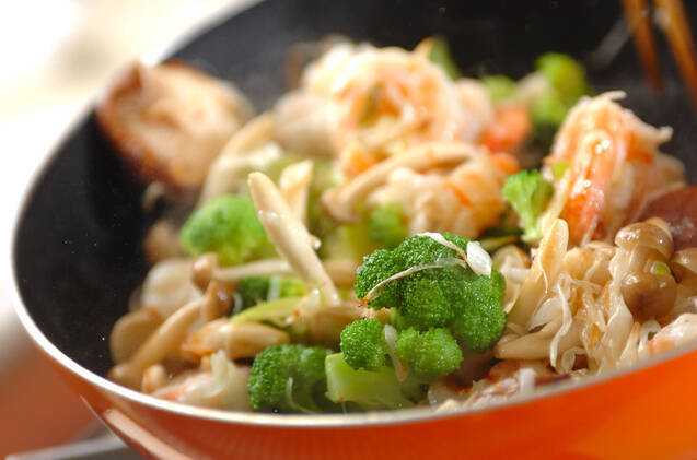 フライパンにサラダ油を強火で熱し、白ネギ、ショウガを炒め、香りがたってきたらシイタケ、シメジを加えて炒め合わせる。全体に油がまわったらブロッコリー、エビを加えて炒め合わせ、<合わせ調味料>を加える。