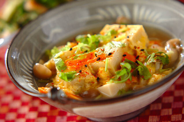 高野豆腐とシメジ、ニンジンをだし汁で煮て卵でとじます。甘めの味付けです。