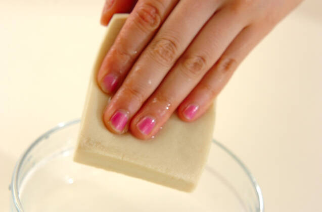 高野豆腐はぬるま湯、または水で柔らかくもどし、両方の手の平にはさんで軽く押さえて水気をきり、小さめのひとくち大に切る。
