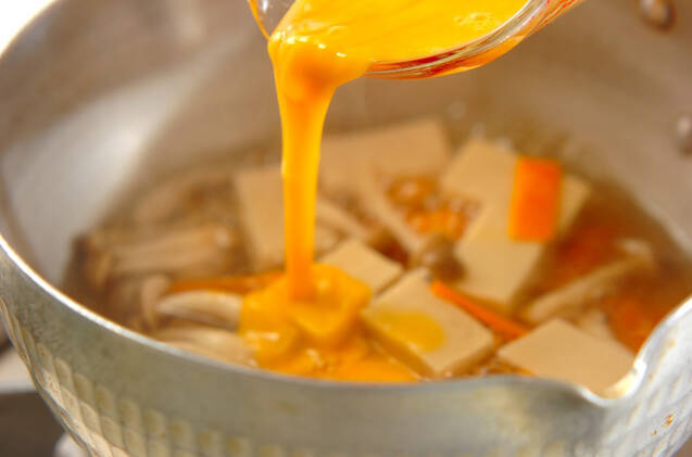 シメジ、ニンジンを加えて中火にし、シメジがしんなりしたら溶き卵をまわし入れ、半熟状態になったら火を止める。