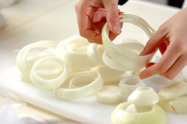 玉ネギは上下を少し切り落とし、皮をむいて幅1cmの輪切りにして、輪をバラバラにする。