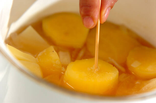 鍋にサツマイモ、ジャガイモ、水、固形チキンスープの素を入れて強火にかけ、煮たったら、玉ネギ、白ネギを加える。再び煮たったら中火にし、サツマイモに竹串がスッと刺さる位まで煮る。