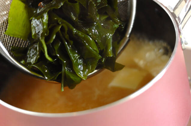 再び煮たったらみそを溶き入れ、再び煮たつ直前にワカメ、刻みネギを加えて器に注ぐ。