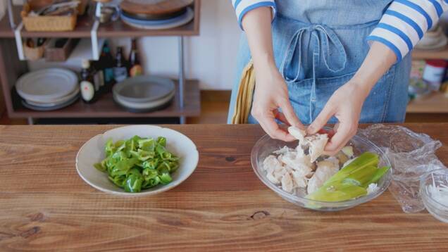 ささ身の上に、ショウガ、ネギの青い部分をのせ、ラップをふんわりとかけて、電子レンジで3分、裏返して2分加熱し放置する。粗熱が取れたら手でさく。