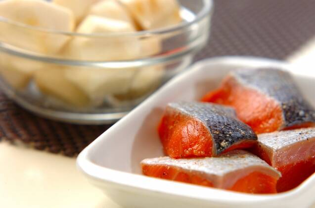 生鮭は食べやすい大きさに切り、塩コショウする。出てきた水分はキッチンペーパーで拭き取っておく。里芋は皮をむき、ひとくち大に切る。分量外の塩をもみ込み、水洗いする。