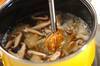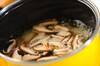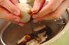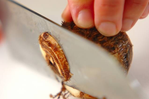 里芋は、皮ごとタワシで水洗いして上下を切り落とす。横半分に切る。