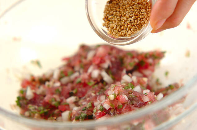 玉ネギ、ショウガ、大葉、白ゴマを加え、さらに混ぜ合わせる。
