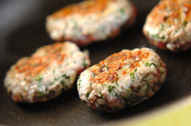 4等分にして小判型に整え、ゴマ油を熱したフライパンで両面焼き色がつくまで焼く。器に盛り、大根おろしをのせてポン酢しょうゆをかける。七味唐辛子を振り、甘酢ショウガを添える。