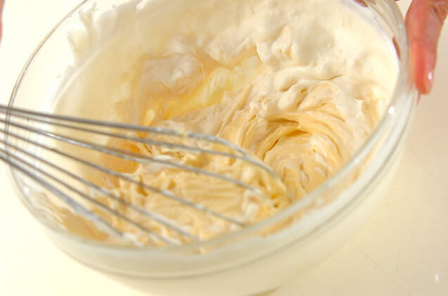 <ホイップクリーム>を作る。ボウルに生クリーム、グラニュー糖を入れ、8分立てにして<ゴマクリーム>と混ぜ合わせる。
