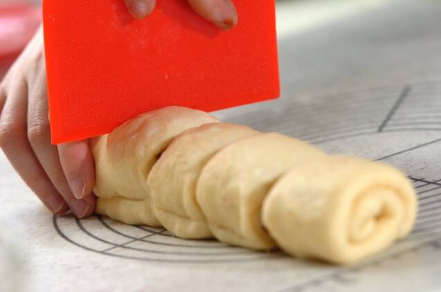 手前から巻き、巻き終わりを下のまま、6等分に切る。オーブンシートを敷いた天板に断面が上になるようにのせる。
