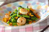 ホウレン草とむきエビ、水煮コーンをバターで炒めた一品。ちょっとした添え野菜に最適です。