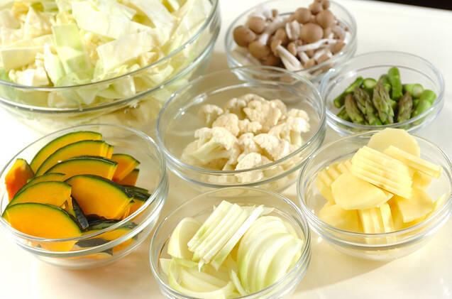 キャベツは食べやすい大きさに切る。玉ネギは幅5mmの縦薄切りに切る。グリーンアスパラはハカマを取り、食べやすい大きさに切る。ジャガイモは皮をむき、カボチャは種とワタを取ってそれぞれ厚さ5mmに切る。シメジは石づきを切り落として小房に分ける。カリフラワーは小房に分ける。