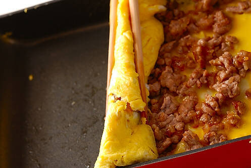 卵を溶きほぐし、卵焼き器または小さなフライパンにサラダ油を敷き、中火にかけて熱する。卵液を一気に加え、菜ばしで手早く混ぜ、半熟になったら1を卵にのせ、芯にして端から巻く。