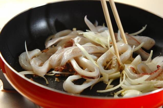 <イカスミソース>を作る。大きめのフライパンに、オリーブ油、ニンニクを入れて中火で熱し、香りがたってきたらイカ、アンチョビ、玉ネギを加えて炒め合わせる。