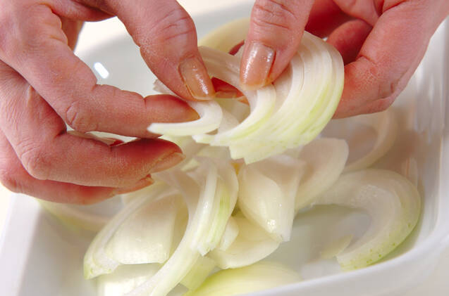 玉ネギは縦薄切りにしてバラバラにほぐす。