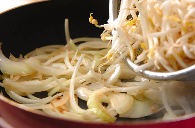 フライパンにサラダ油を強火で熱し、玉ネギが透き通る位まで炒めて、モヤシ、ニンジンを炒め合わせる。