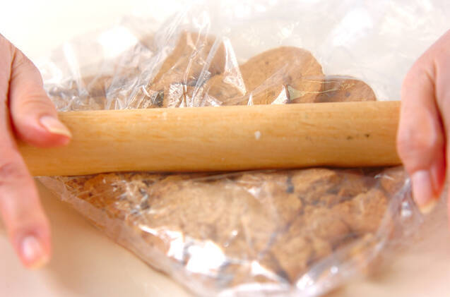 型に分量外のバターを薄く塗って、オーブンシートを底と側面に敷く。<クッキー底>のクッキーはビニール袋に入れて麺棒等で転がすように押さえて細かく砕く。無塩バター50gは耐熱容器に入れてラップを掛けずに電子レンジで加熱し、溶かしバターにして、砕いたクッキーとしっかり混ぜ合わせ、型の底にきっちり敷き込む。バニラビーンズはサヤに切り込みを入れ、中身をしごき出す。