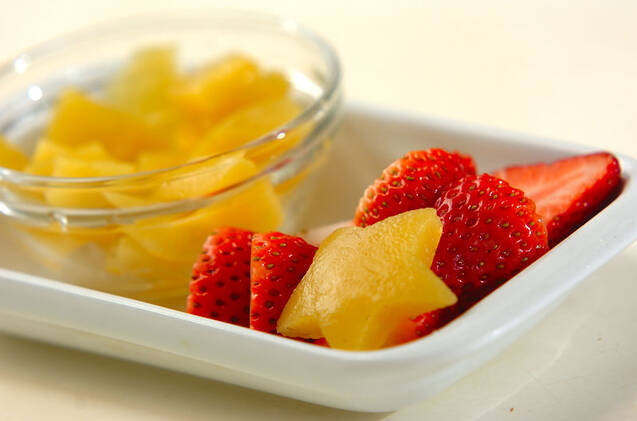 黄桃は、丸みのある部分を厚さ5~10mmに削ぎ切りして、星型で抜く。残りは幅5mmのイチョウ切りにする。イチゴはヘタを除き、縦半分に切る。