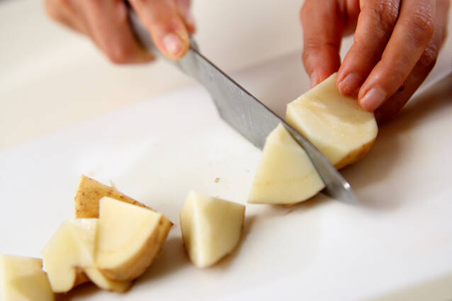 ジャガイモは皮ごときれいに水洗いし、小さめのひとくち大に切り、水に放つ。