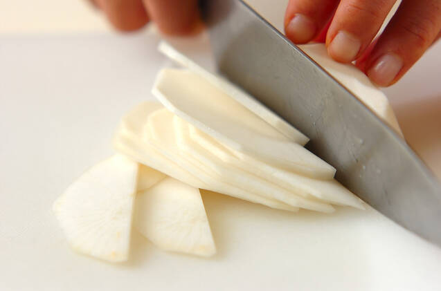カブは皮をむいて縦半分に切り、横に薄切りにする。