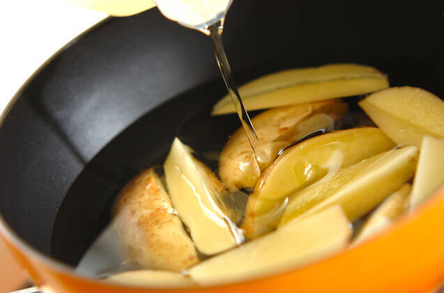 新ジャガイモは皮ごときれいに水洗いして水気を拭き取り、大きい場合は食べやすい大きさに切って大きめのフライパンに並べ入れ、ヒタヒタの量の揚げ油を注ぎ入れて弱めの中火にかける。