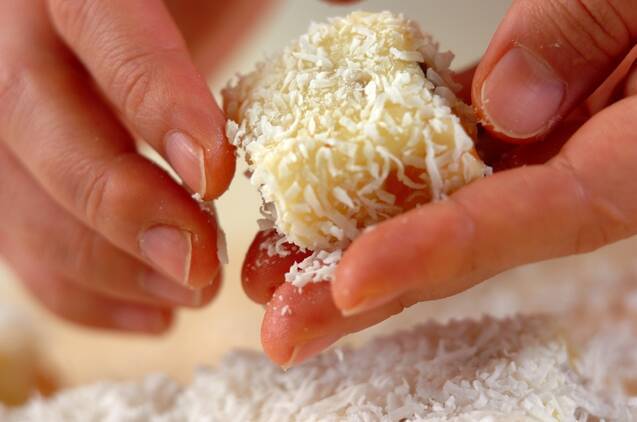 冷えかたまったらバットから取り出し、温めたナイフで3cm角にカットし、形を整えながら全体にココナッツファインをまぶして仕上げる。