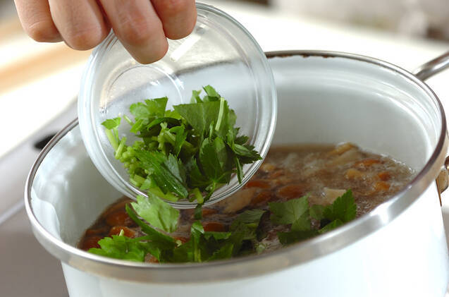 煮たったらアクを取って火を止め、ミツバを加えてひと混ぜし、器に注ぎ分ける。お好みで七味唐辛子を振る。